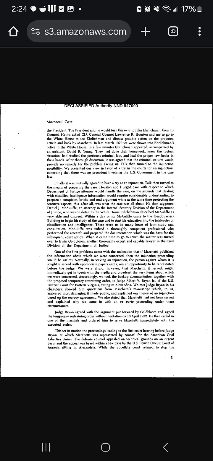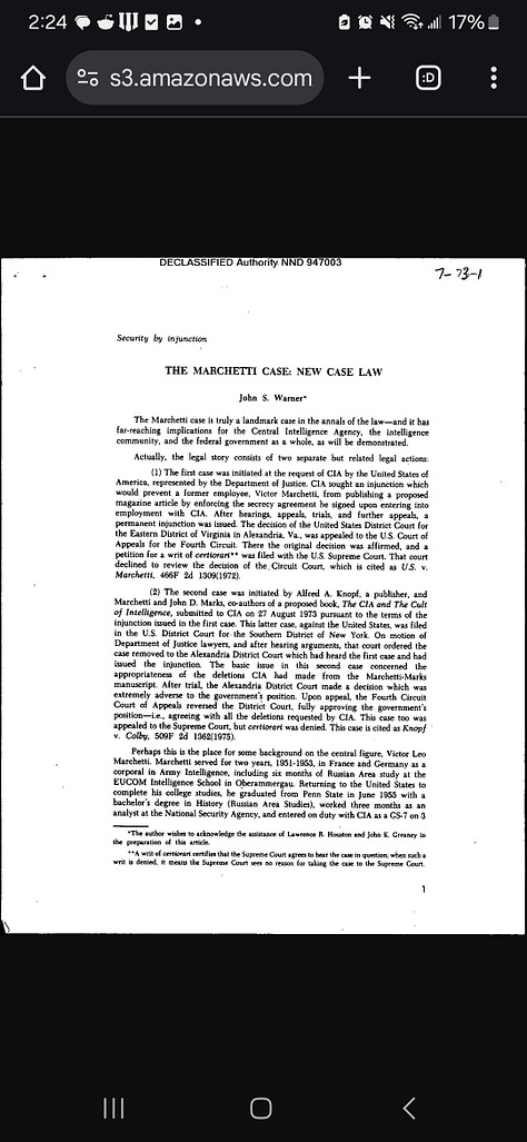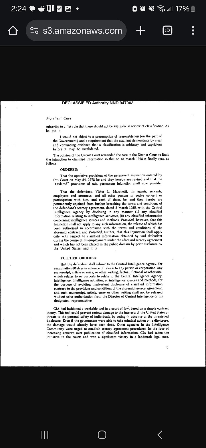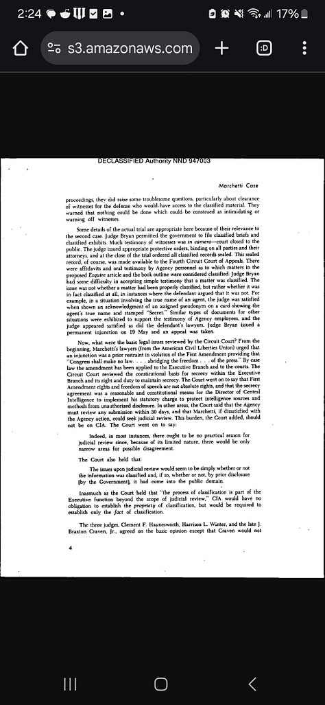 Marchetti's case established much of the legal precedent that the CIA/DoD use to this day to censor critics and enforce prepublication security reviews. Again, it's truly hard to put into words how gross it is to watch ignorant hordes of armchair whistleblower protection attorneys malign genuine whistleblower who are legally compelled to engage in a censorious review process that the masses are wildly ignorant of.