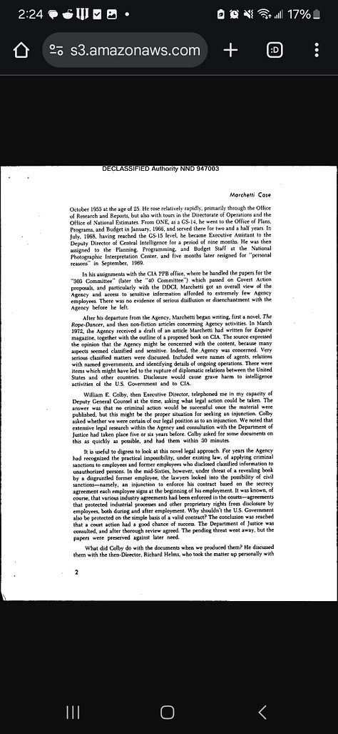 Declassified documents from the Deputy General Council at the CIA, elaborate in great detail about the lengths that the CIA & DoJ went to censor Marchetti while establishing legal precedent to use the security review process to undermine former employees turned critics.