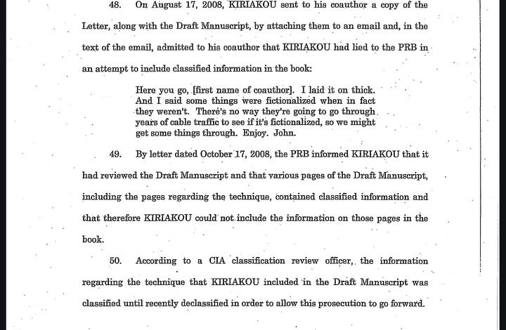 A criminal complaint against Kiriakou alleges he made false statements to the CIA in relating to the submission of drafts of a book manuscript to the Publication Review Board (PRB.)